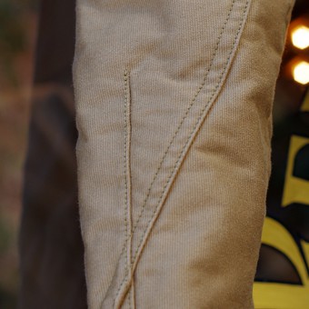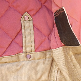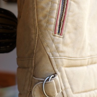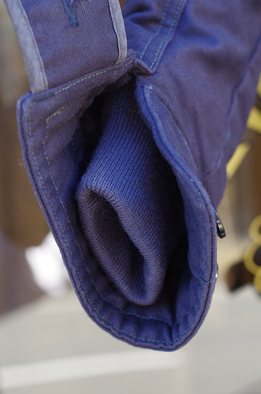 Dカンの二重構造となっている。また裾を絞ることによりライディング時における風の巻き込みを
