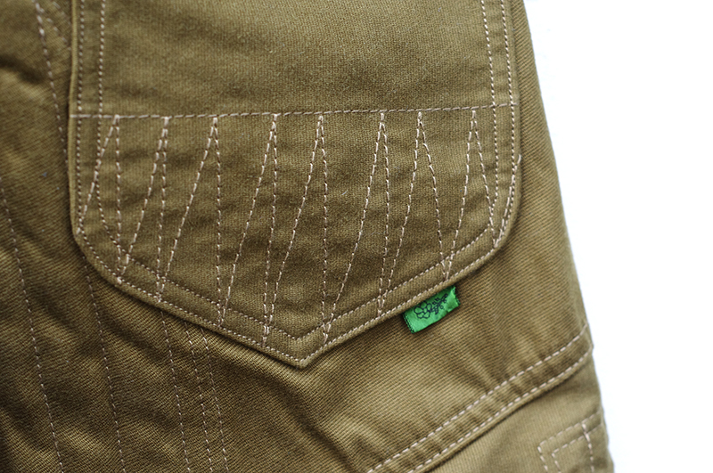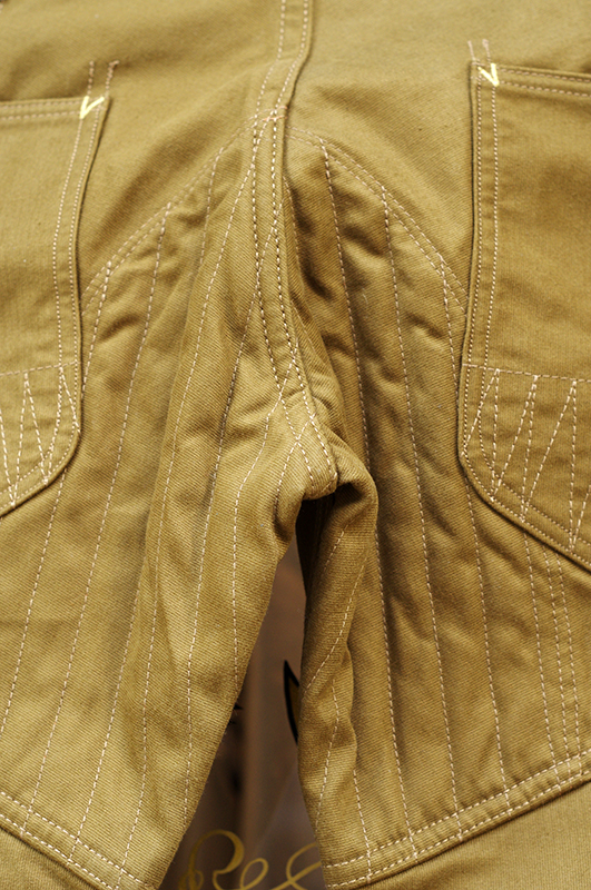 ・前面の腿から膝下へかけてと、尻部にパテッドを施し、パデットパンツとしての雰囲気を盛り上げる。