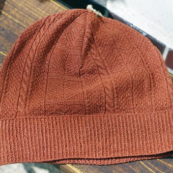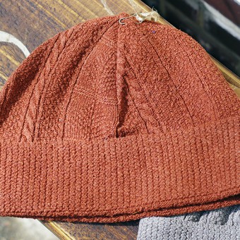 カーディガン、ベスト共にシルク100%の糸で編まれたガンジー柄のニットキャップ。