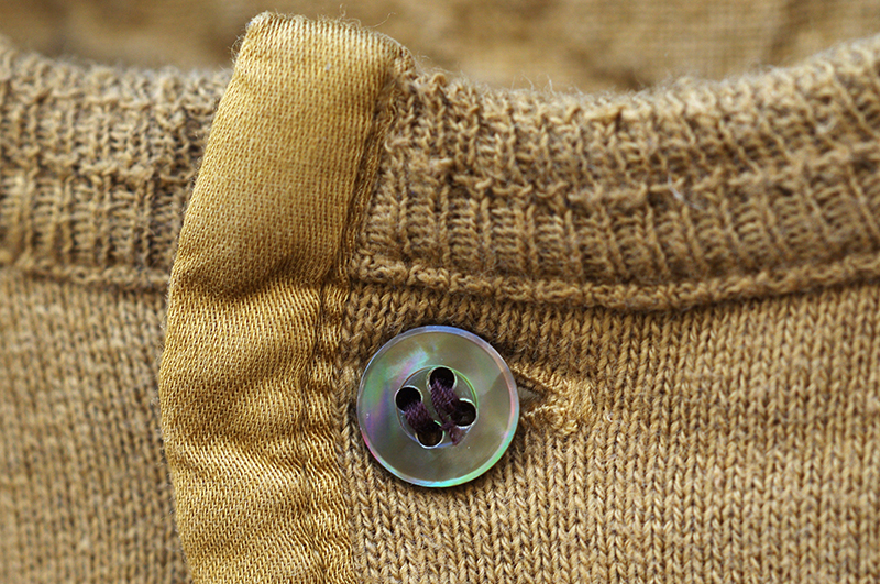 また、首リブと袖リブに施された編み模様、前あきのパイピングのサテン使いなど