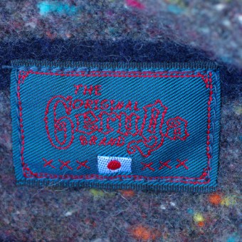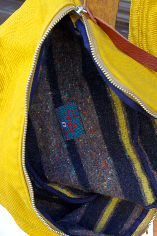 裏地には、ボーダー柄のブランケットを使用、内容物を保護するためのクッション性とデザインアクセントを担う。