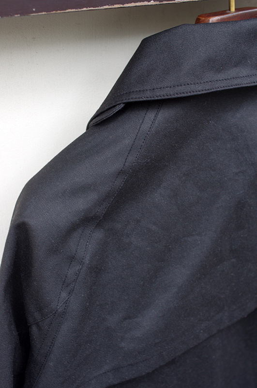 ディティールと前端のカーブに惚れフランス陸軍バイク部隊のM38モーターサイクルジャケットをモデルに現代の日常に着用出来る様にサイズ感、衿の大きさなどRCS CLOTHING風に落とし込みました。素材はMillerain社のオイルドコットン “BONNEVILLE” を使用し裏地を付けました。袖口には隠しリブ、内側に内ポケットを左右の胸に脇にはウォームポケットを付けました。素材の特徴として暴風・防寒ですので2輪車に乗っていただく時にも最適のアイテムです。